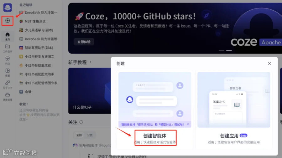 2. 进入“开发平台-快速开始”,点击左上角“+”号,选择“创建智能体”。[k]