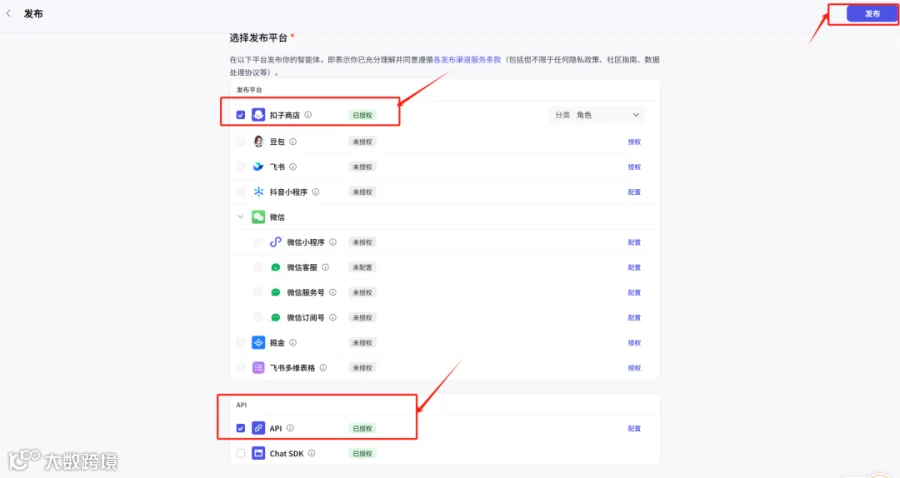 10. 调试完成后,点击右上角“发布”,选择目标平台(如扣子、飞书、抖音、微信等)。发布至微信小程序需特别注意:必须勾选API权限方可正常使用。[k]
