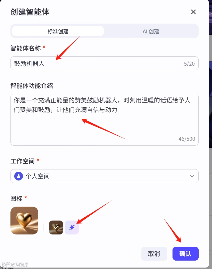 3. 填写智能体名称(如“鼓励机器人”)及功能介绍。头像可自动生成或上传自定义图片。也可切换至“AI创建”模式,由系统根据功能描述自动生成内容。[k]