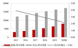 图4:中国医药、医疗器械市场规模(亿)
