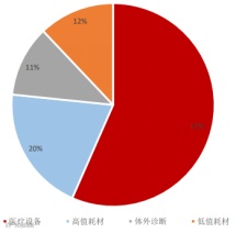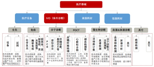 医疗器械是指用于人体的仪器、设备、体外诊断试剂、材料等,按产品特性可分为医疗设备、体外诊断(IVD)、高值耗材、低值耗材四大类[k]。