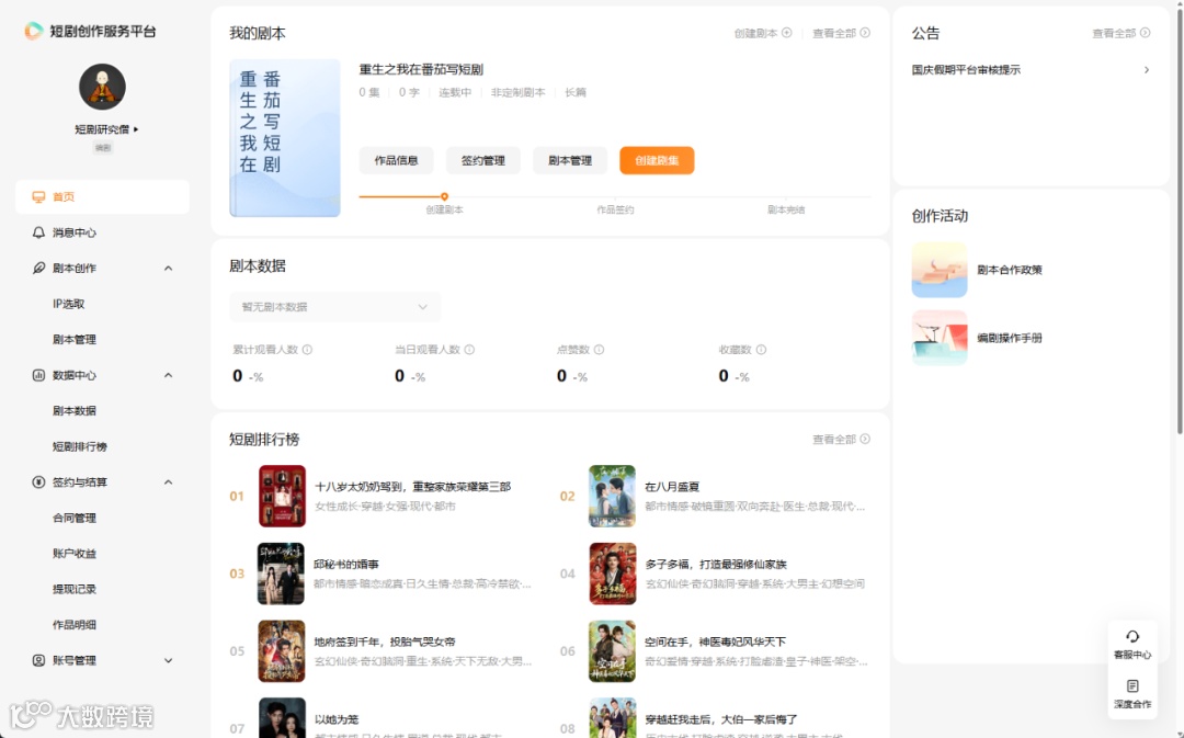 中间上方是你目前正在创作的剧本信息;正中间是你的剧本相关数据;下方是现在热门短剧的排行榜。