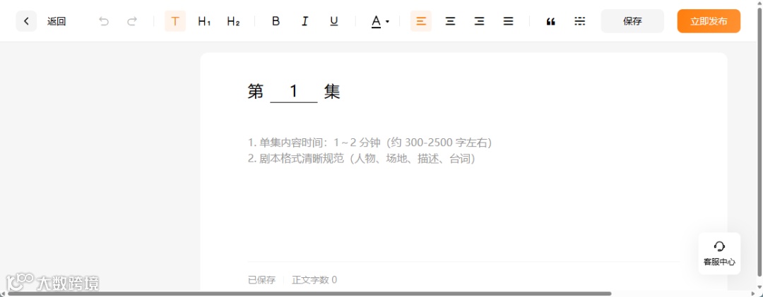 选择“创建剧本”,可以进到编辑页面,是一个文本编辑器,画面很简洁,和飞书的界面有些类似,页面有相关创作的一些提示。