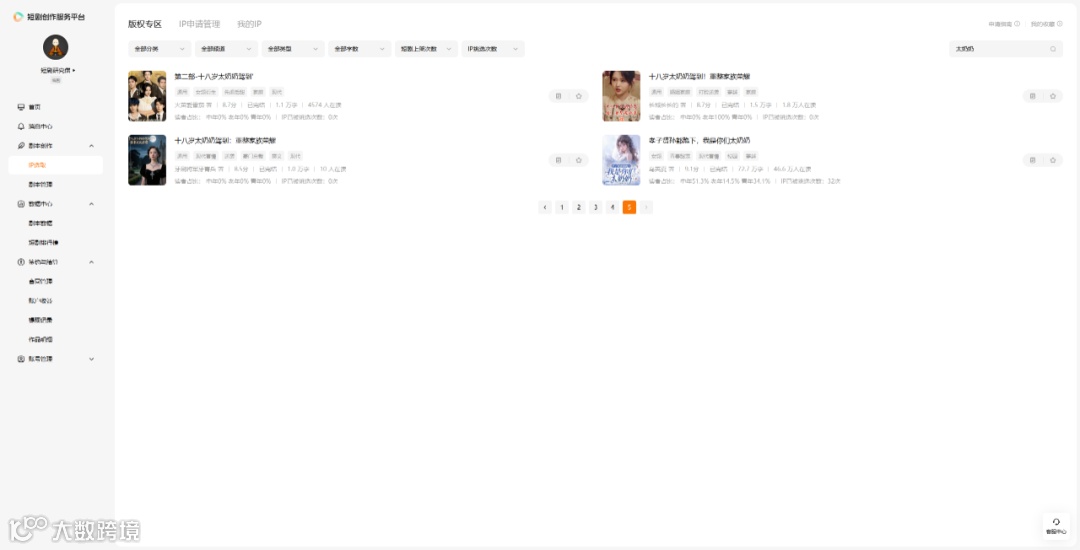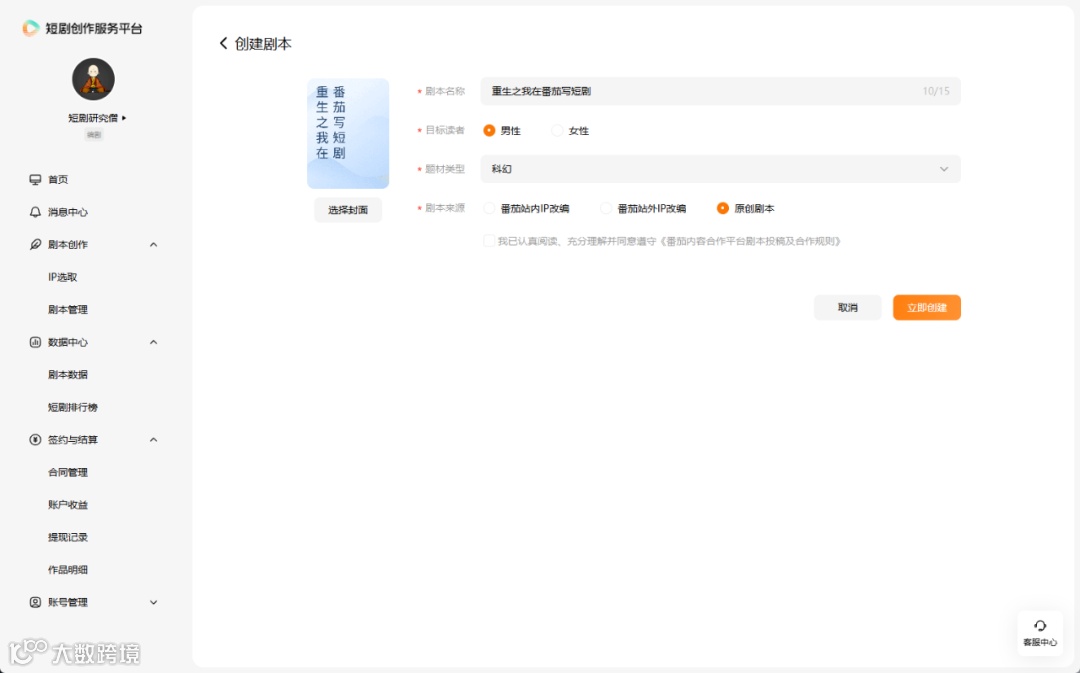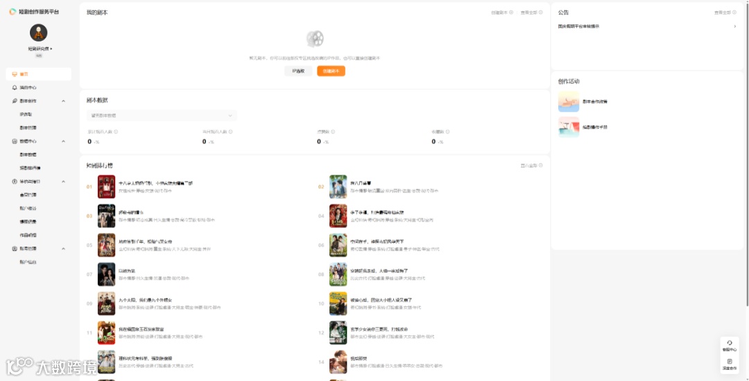 左侧是导航栏,可以查看剧本、数据、签约等相对应的板块,整体流程和逻辑还是非常清晰易懂的。