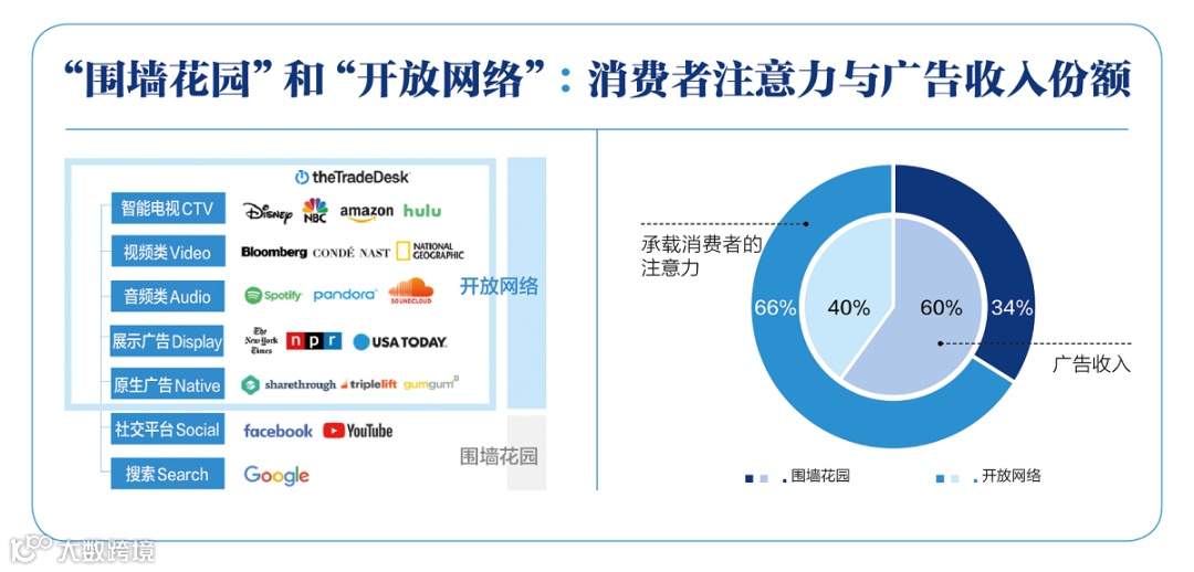 数据显示,全球消费者2/3的注意力集中在“开放网络”,但其仅获得40%的广告收入,而占据1/3注意力的“围墙花园”却拿走60%份额[1]。这一错配表明,“开放网络”的广告潜力尚未充分释放[1]。