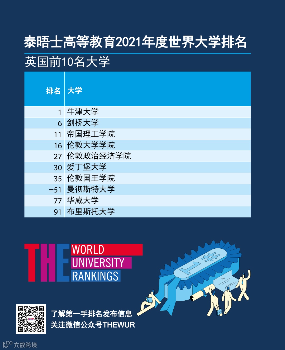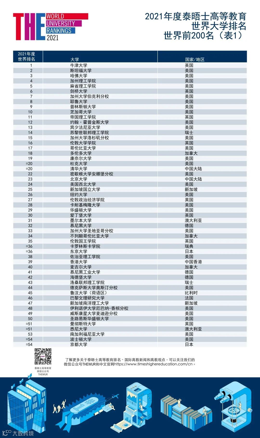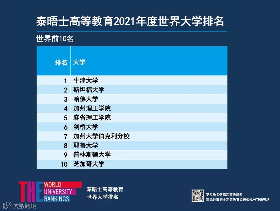 2020年9月2日,泰晤士高等教育(THE)发布2021年度世界大学排名。本次排名覆盖来自93个国家和地区的1527所高校,较去年增长9%,为历年之最[k]。