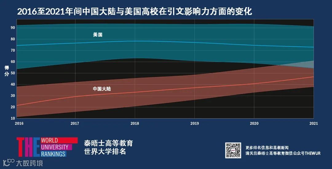图:中国大陆高校在研究影响力方面与美国高校差距持续缩小[k]