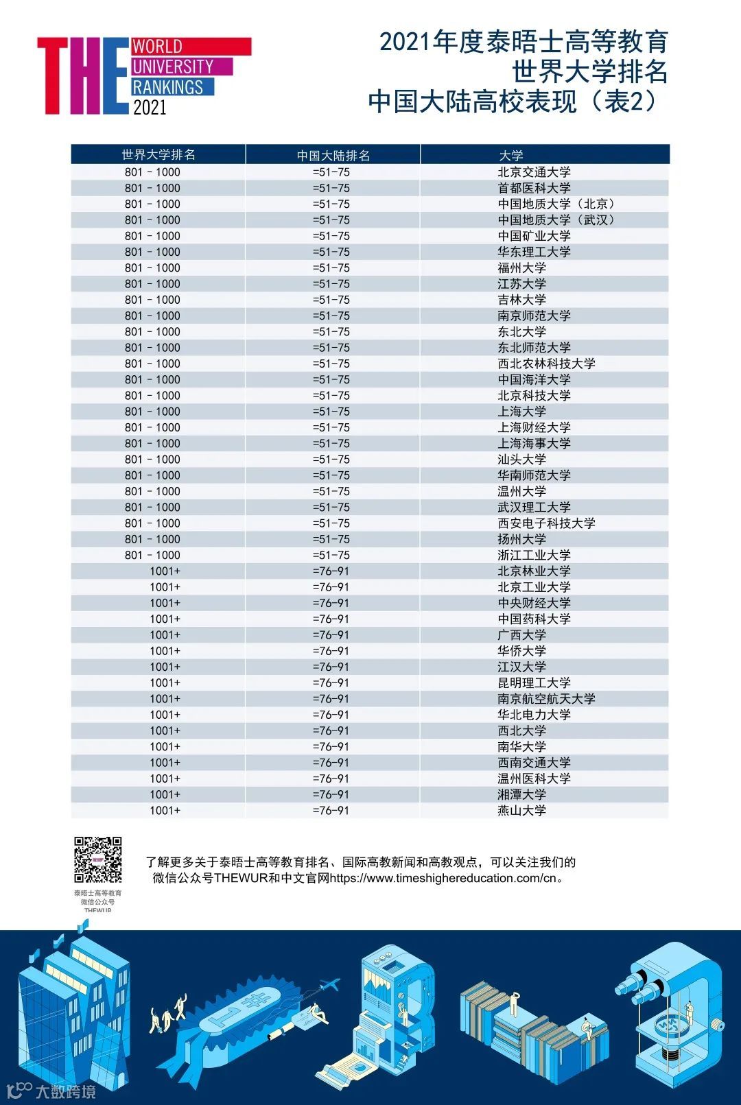 中国大陆共有91所高校入榜。其中26所排名上升,占比29%;49所保持稳定。新入榜的10所高校中,北京化工大学与浙江师范大学位列501–600名,西交利物浦大学位列600–800名[k]。
