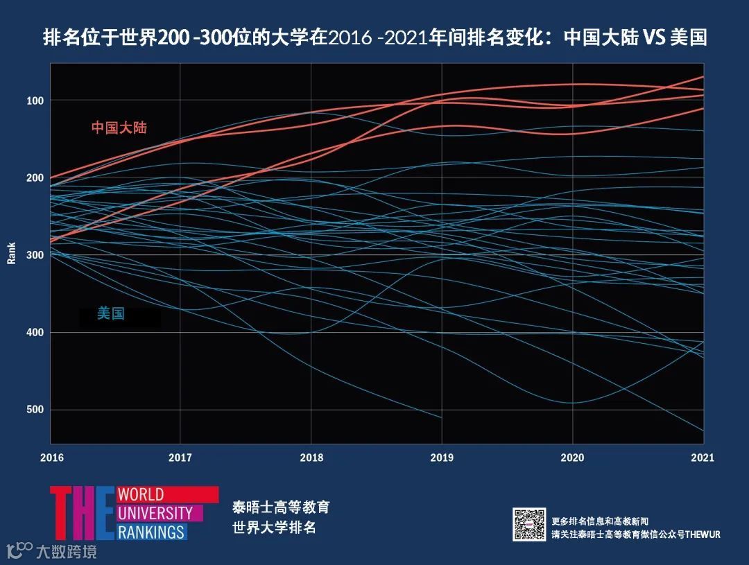 图:2016至2021年间世界排名200-300位中国大陆和美国高校的变化[k]