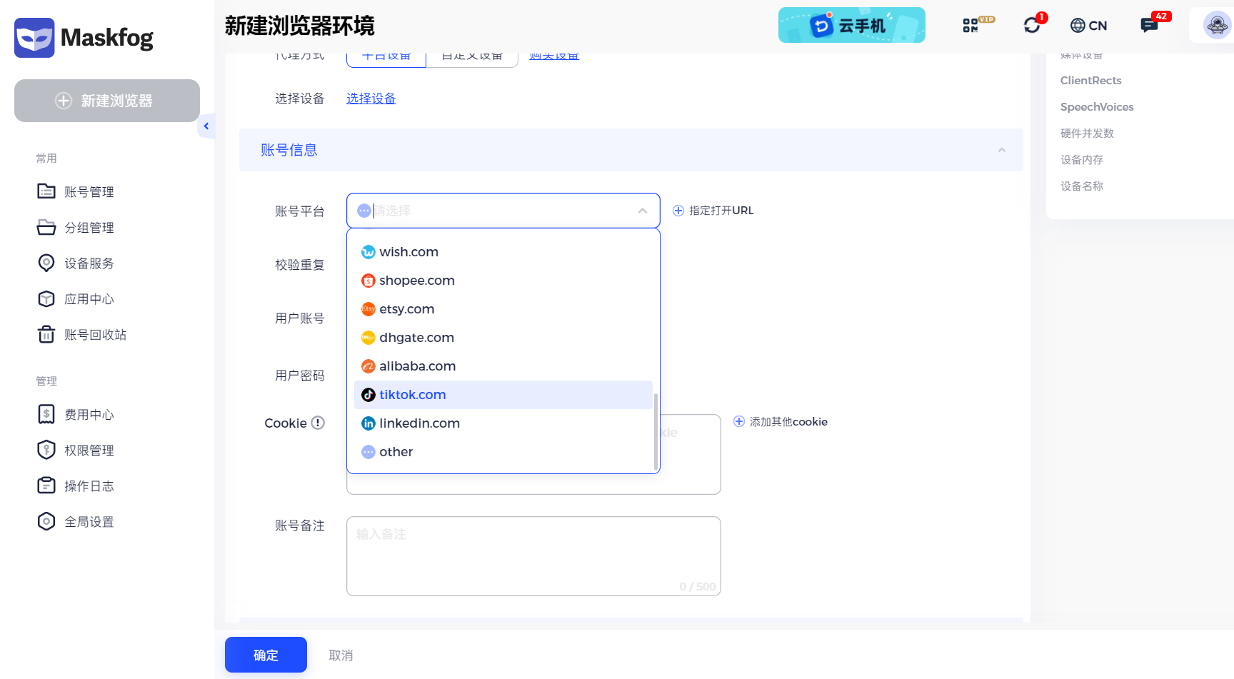 Maskfog指纹浏览器是TikTok店群运营的核心工具,它通过为每个TikTok店铺创建独立的浏览器环境,从时区、默认语言、User Agent、字体、分辨率等指纹信息进行隔离设定,确保店铺间环境不互斥,防止因关联问题导致的封店风险。