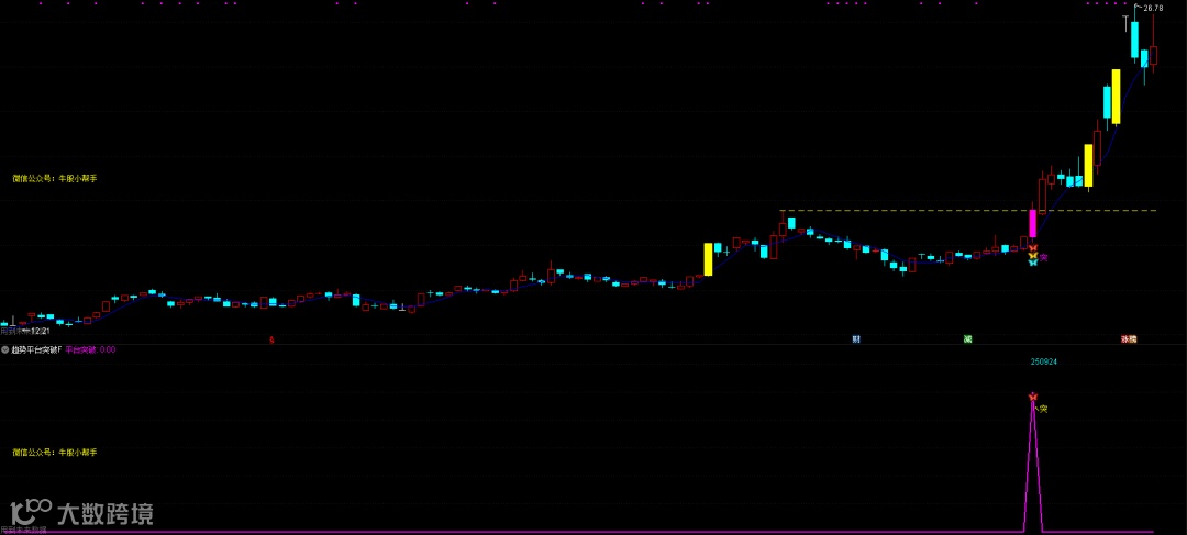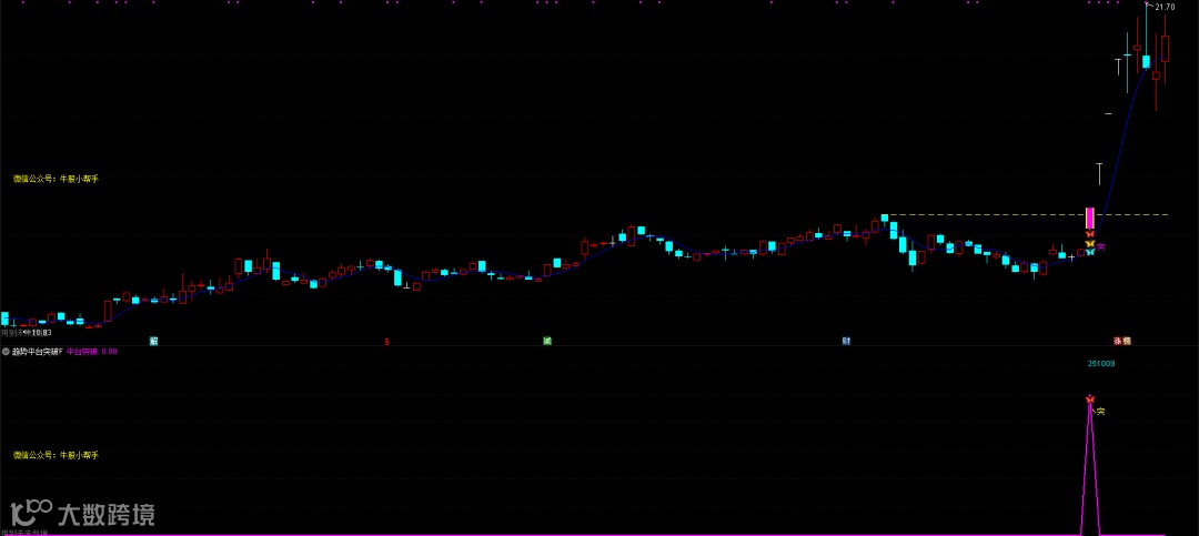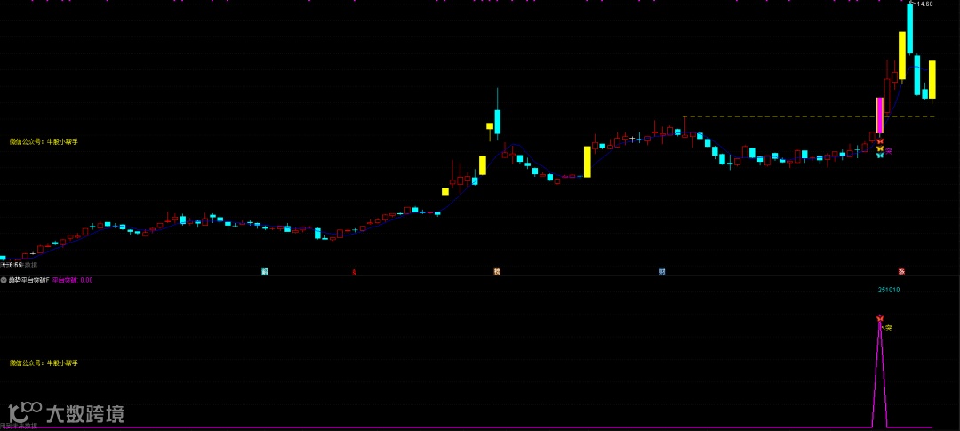 DRAWTEXT_FIX(C>O,0.01,0.51,0,'微信公众号:牛股小帮手'),COLORYELLOW;