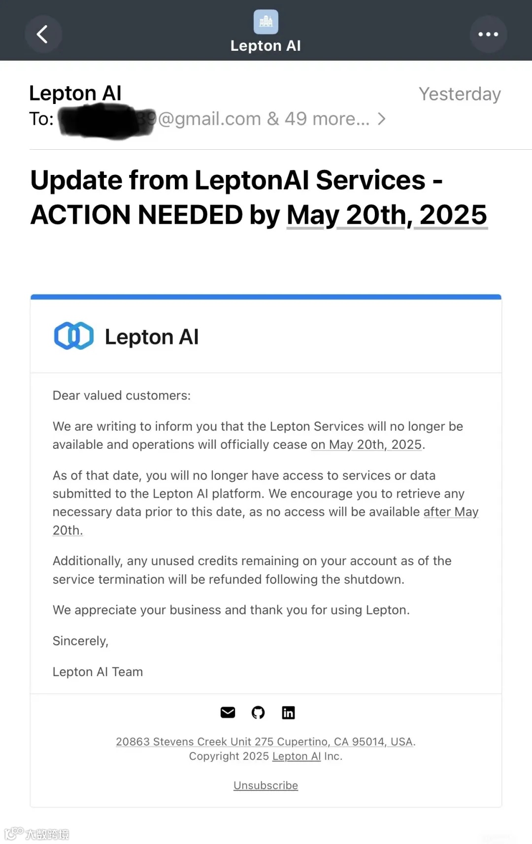 2025年5月20日起,Lepton AI正式停止运营,用户将无法访问平台服务及数据,官方建议用户提前下载备份。账户中未使用的积分将在服务关停后退款[k]