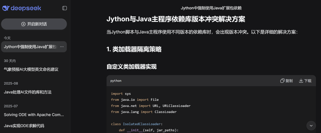 AI时代必须先问问豆包、DeepSeek等,可以用Jython写一个隔离类加载的代码,在天擎数据下载代码中只从MUSIC的依赖库中加载相关类,从而解决依赖库版本冲突的问题。