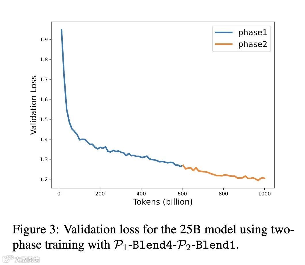 证明了使用1万亿token下采样数据进行混合策略设计,并将其扩展到15万亿token和250亿参数模型的可扩展性。