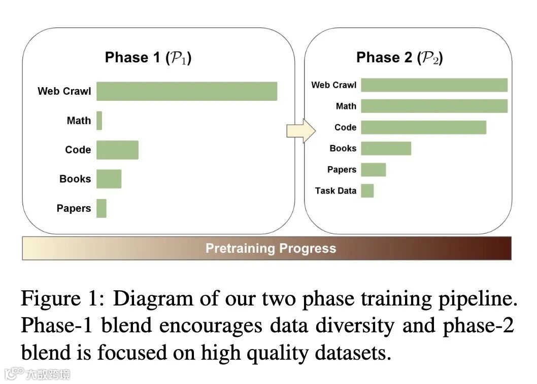 两阶段预训练: 论文提出了一种用于大型语言模型(LLM)的两阶段预训练方法。第一阶段侧重于多样化的数据(主要是网络爬取数据),第二阶段则强调高质量的数据(数学、代码、维基百科等)。这种反直觉的方法,即优先使用多样化数据,带来了显著的性能提升。 -