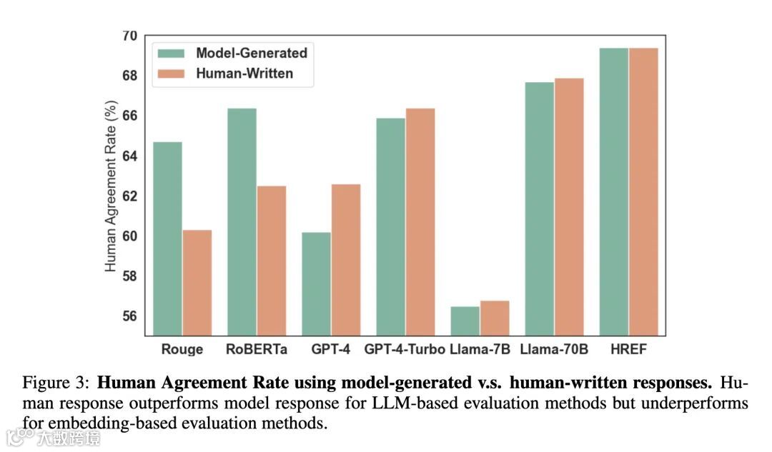 人类响应的正交视角:人工编写的响应与模型生成的响应相比,提供了正交的视角。在判断模型输出时,它们作为附加上下文比作为直接比较参考更有效。令人惊讶的是,即使在人工引导的评估更准确的情况下,LLM 也经常更喜欢模型生成的响应而不是人工编写的响应。 -