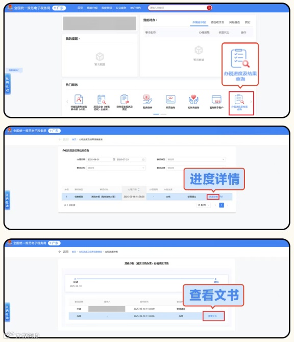 然后去【办税进度及结果查询】→【进度详情】→【查看文书】,就能下载 “清税证明”—— 广州的清税证明是 PDF 电子档,和纸质版有同等效力,后续去市场监管局注销营业执照时,直接上传电子档就行,不用打印(当然也可以打一份备用)。