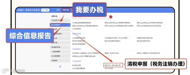 常规路径:【我要办税】→【综合信息报告】→【清税申报(税务注销办理)】;