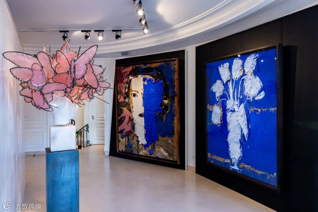 在本次展览中,瓦尔德斯与历史的对话被赋予新的当代表达。他创作的巨型女性头像庄重而不失轻盈,头部装饰着以穆拉诺玻璃、树脂与钢材制成的蝴蝶,宛如漂浮于现实与想象之间。旁边的油画与粗麻布拼贴作品保留了艺术家创作的肌理痕迹,其丰富的材质感唤起绘画传统,又突破了风格与媒介的界限。
