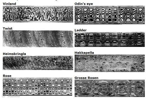 拿现代手工折叠锻打的大马士革刀来说,它就是典型的锻造型花纹,跟乌兹钢那种铸造型花纹不同的是,锻造花纹的纹理是连续流畅的,十分美观。