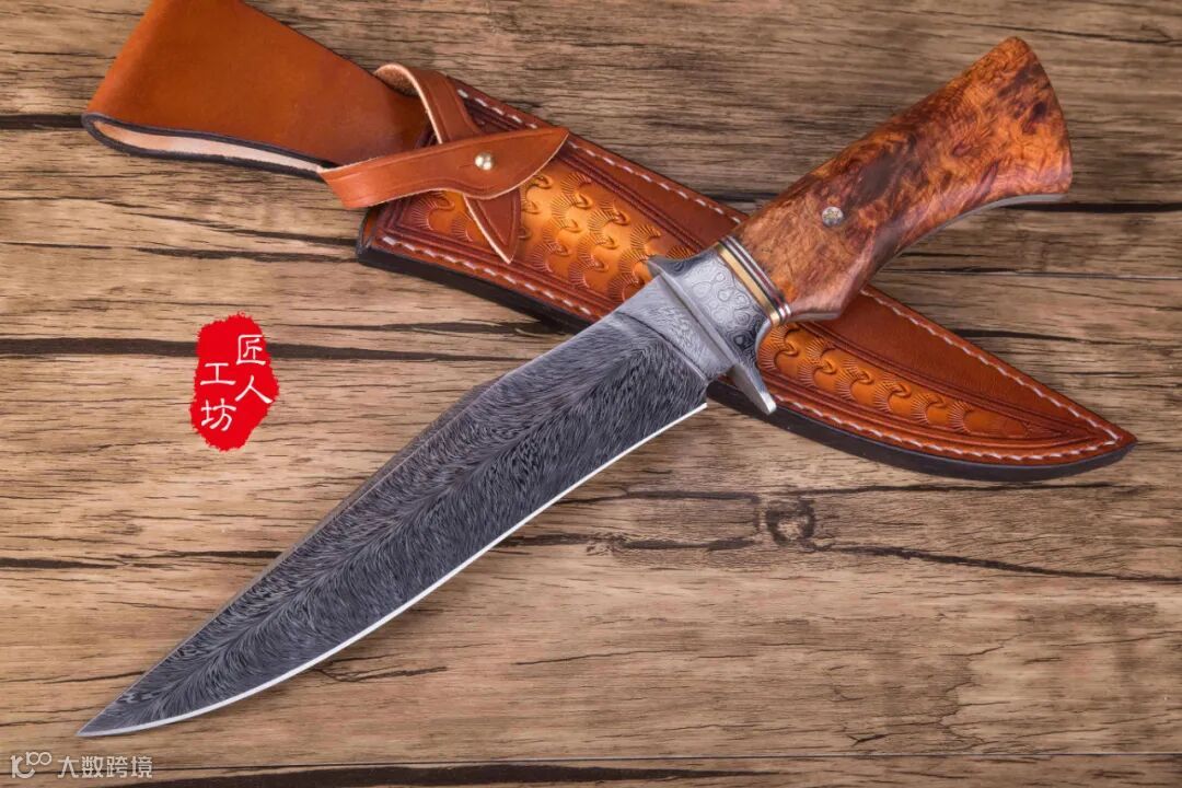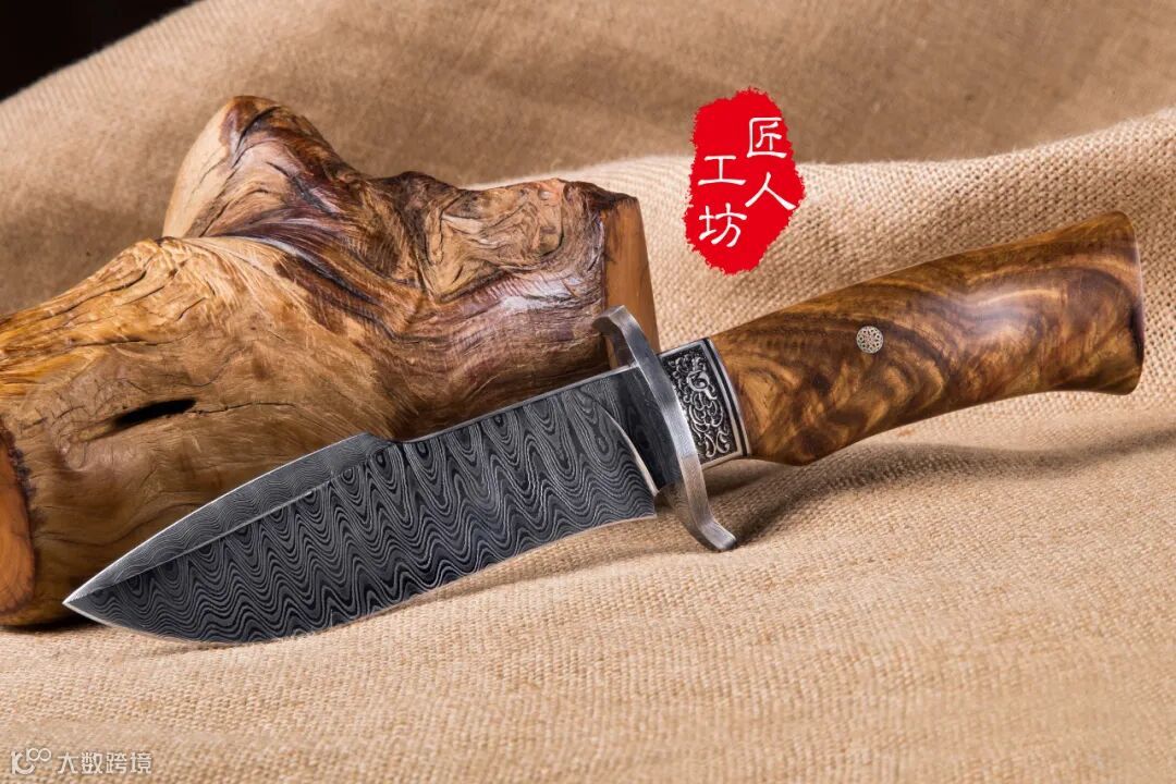 手锻大马士革钢,是以优质的高碳钢为基础材料,经过加热、折叠,反复锻打而成的合金钢,具有坚硬、锋利、刚柔并济等特点。尤其引人注目的是,经过反复锻打的大马士革钢刀,钢铁层叠交缠,刀身上布满蜿蜒曲折的花纹,有的如水波,有的似玫瑰,有的像羽毛,变幻莫测。