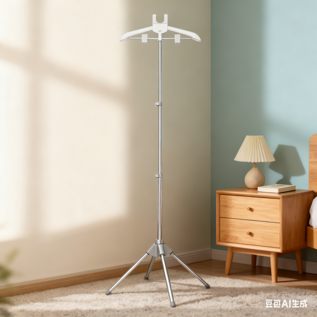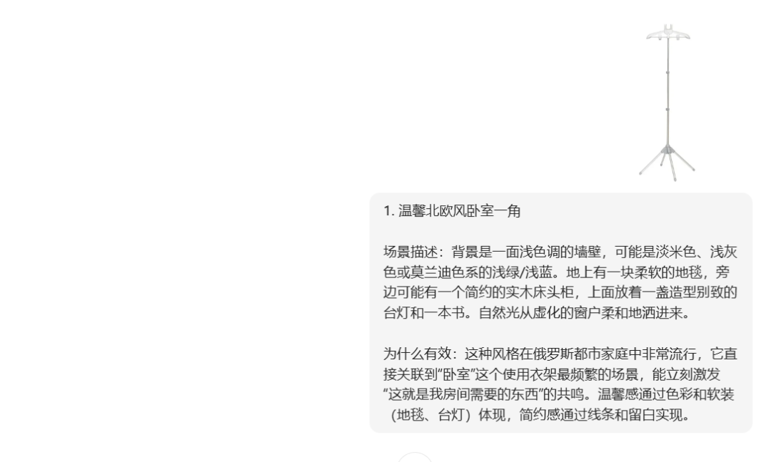 3.细节: 图片风格是温馨简约,主打挂衣架底部稳固和金属材质的质量,有多个挂钩和支架,能够融入居家的生活环境。目标客户是25-40岁的家庭主妇。