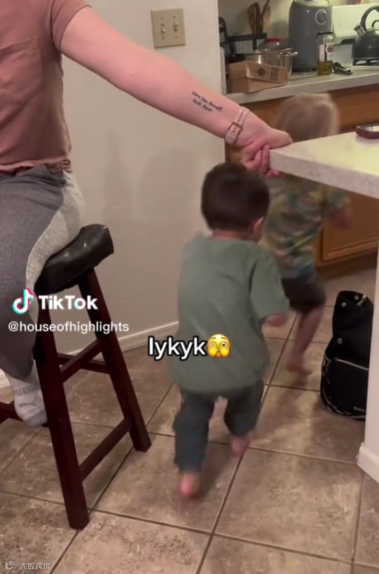 比如在TikTok上的一个视频里,有个家长在孩子经过桌边的时候迅速握住桌角防止孩子撞到,视频中配了字幕“lykyk”。