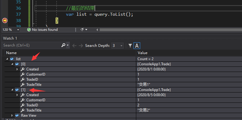 上面的 tradeList 就是内存中的集合,现在有一个问题,我想查询一下 trade 表中 CustomerID in (1,2,10) && Created <= '2020-08-01' 的记录是否和内存中的 tradelist 一致。
