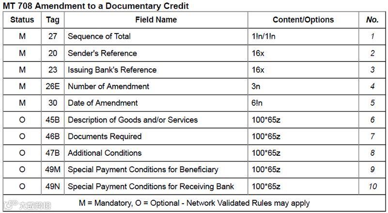 总体而言,升级后MT707报文与MT700实现栏位一一对应,所有修改均通过结构化栏位完成,显著提升信用证修改的规范性、透明度与处理效率[k]。