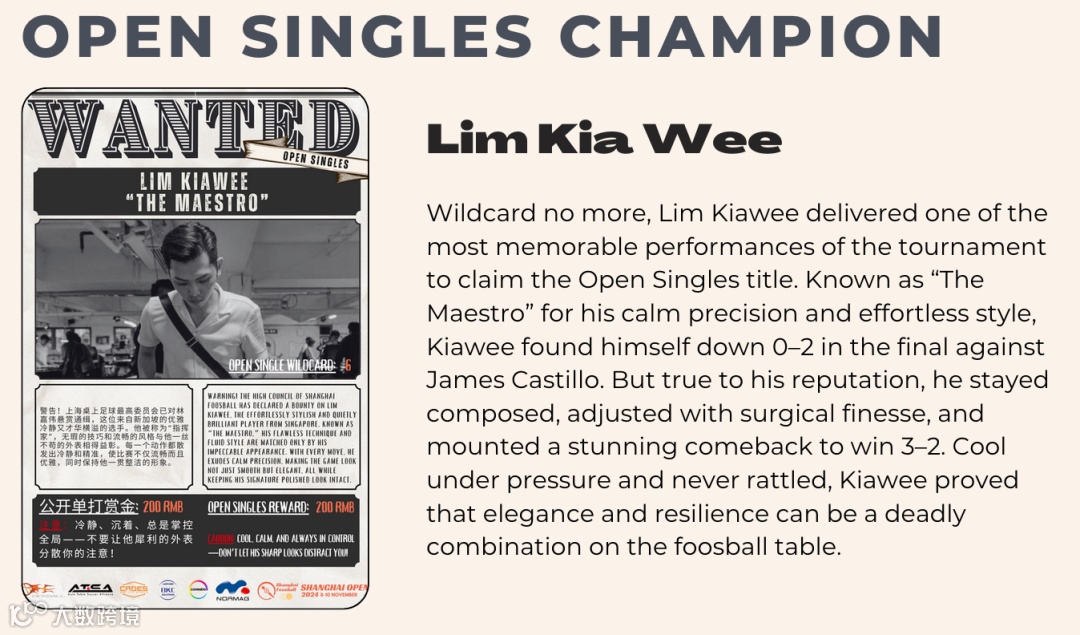 在 2024 年上海公开赛上,Lim Kia Wee 奏出了令人难忘的一幕。作为外卡选手出战,他在公开单打决赛中一度以 0–2 落后于 James Castillo,却凭借惊人的冷静与韧性完成逆转,以 3–2 夺得 公开单打冠军。
