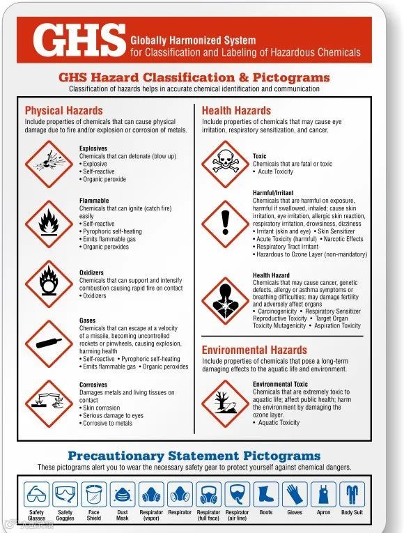 化学品由于其固有的化学、物理和毒理学特性,对人员的健康和安全构成危害。化学品可分为几种不同的危险类别。危险等级将决定类似材料应如何储存和处理,以及需要什么特殊设备和程序来安全使用它们。每个化学容器,无论是由供应商提供还是在实验室生产,都必须包括标签,清楚地识别与该化学物质相关的危害。通过参考该化学品的SDS可以找到该化学品的更详细的危害信息。