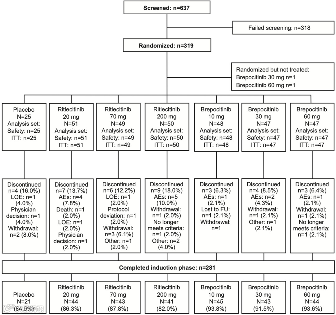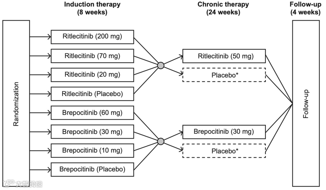 筛选期后,患者被随机分配 (4:4:4:1:4:4:4:1) 至口服每日一次 (QD) 的 ritlecitinib (20, 70, 或 200 毫克) 或匹配安慰剂,或 QD 的 brepocitinib (10, 30, 或 60 毫克) 或匹配安慰剂 (图 1A, 补充材料)。
