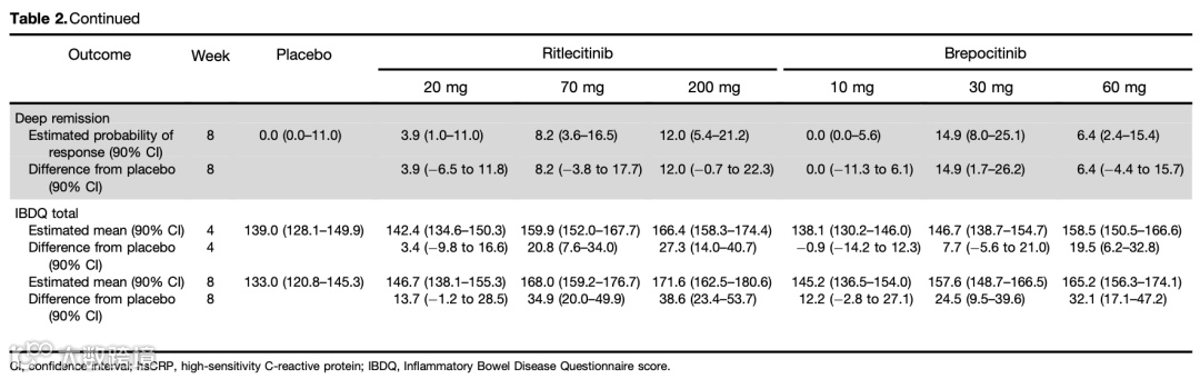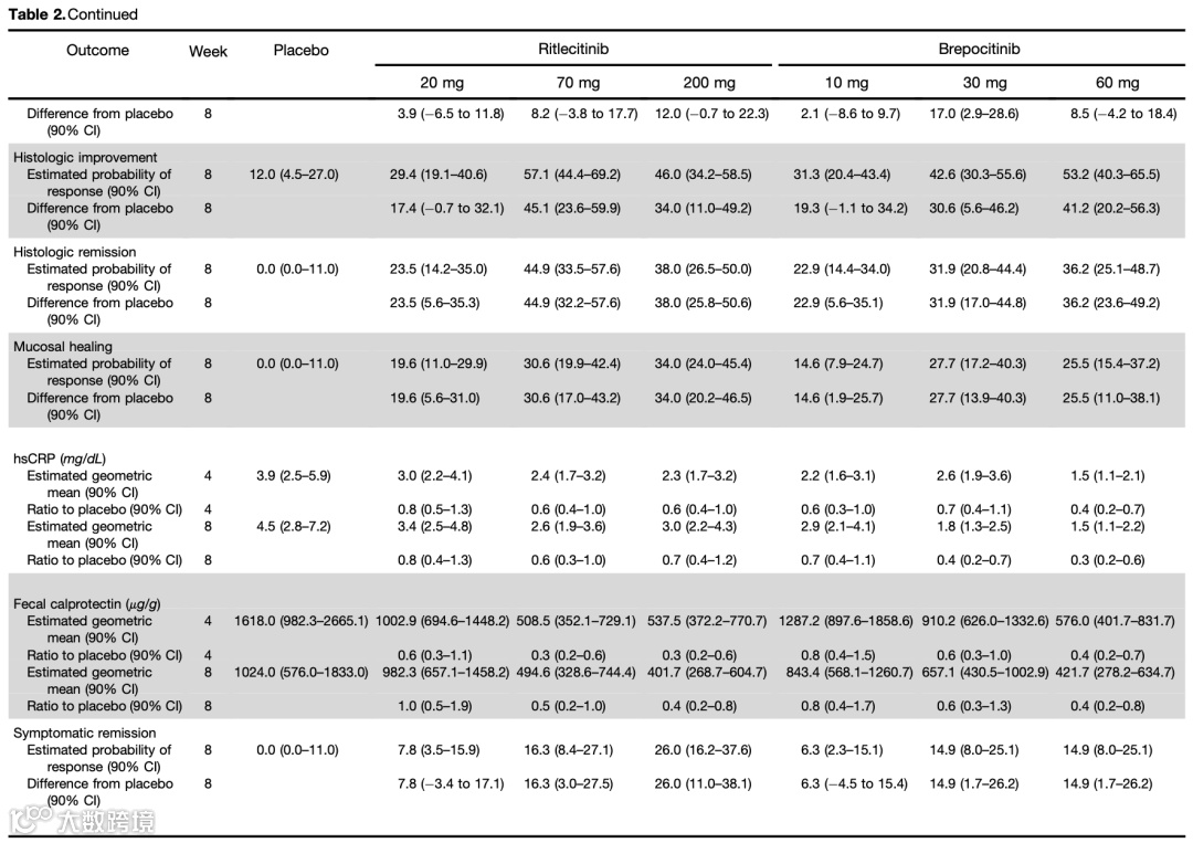 在第 8 周时,ritlecitinib 200 mg (36.0% [90% CI, 24.9%–47.4%]) 和 70 mg (32.7% [21.7%–44.4%]) 组以及 brepocitinib 60 mg (25.5% [15.4%–37.2%]) 和 30 mg (25.5% [15.4%–37.2%]) 组中达到改良临床缓解的患者比例显著高于安慰剂组 (0% [0%–11.0%]) (表 2)。