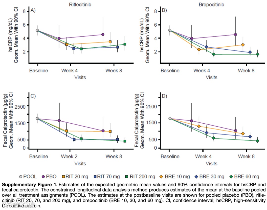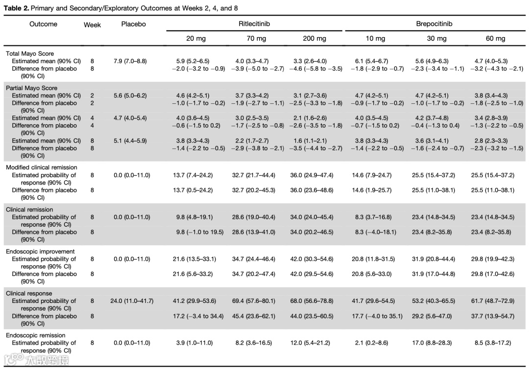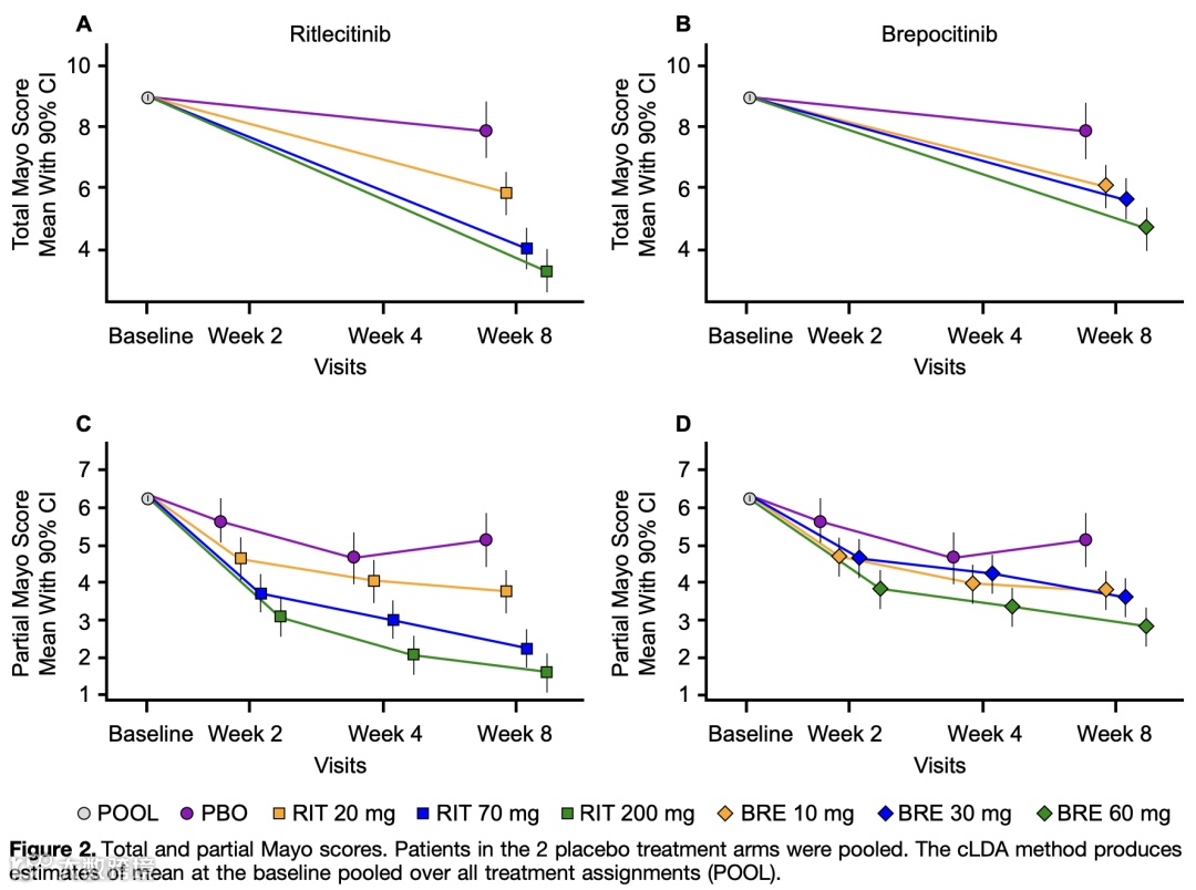 在第 2 周时观察到部分梅奥评分的剂量依赖性下降,并且在第 8 周时,所有剂量的 ritlecitinib 和 brepocitinib 组与安慰剂组相比,下降幅度更大 (图 2C 和 D, 表 2)。