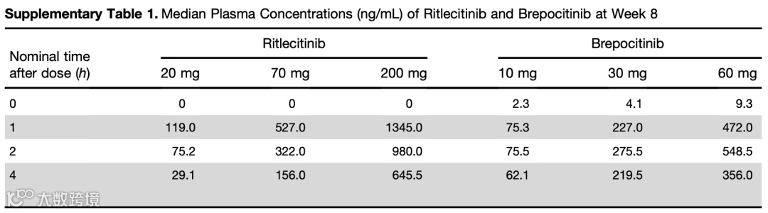 在第 8 周时观察到中位血浆 ritlecitinib 和 brepocitinib 水平的剂量依赖性增加,此时样本在给药后 4 小时内收集。ritlecitinib 和 brepocitinib 的中位达峰浓度时间分别在给药后 1 小时和 2 小时观察到 (补充表 1)。