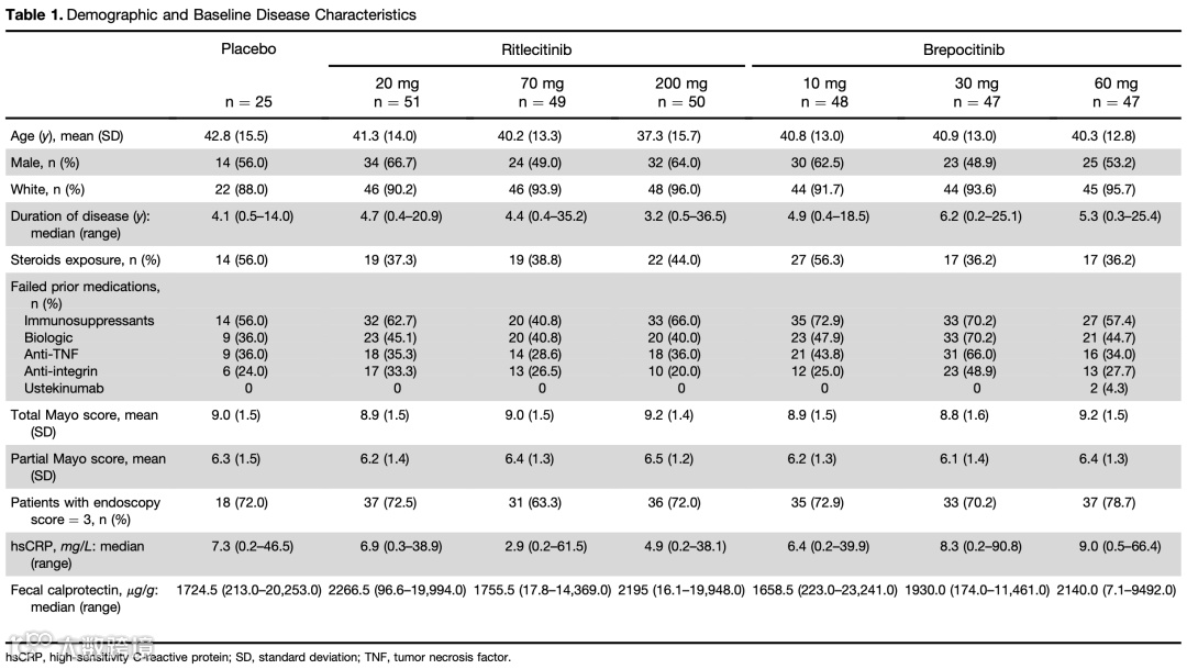 大多数患者 (62%) 年龄在 18-44 岁之间。各组的基线特征在年龄、性别、疾病持续时间、既往治疗、TMS 和部分梅奥评分方面大致相似 (表 1),除了 brepocitinib 30 mg 组既往生物制剂治疗失败的比例略高。