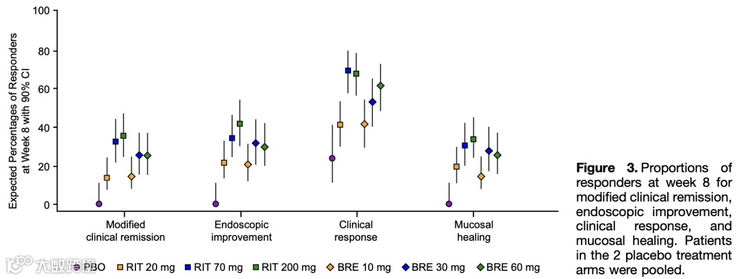 内镜改善、临床应答和黏膜愈合的结果相似;在第 8 周时,与安慰剂相比,大多数这些参数观察到剂量依赖性的治疗效应增加 (图 3, 表 2)。