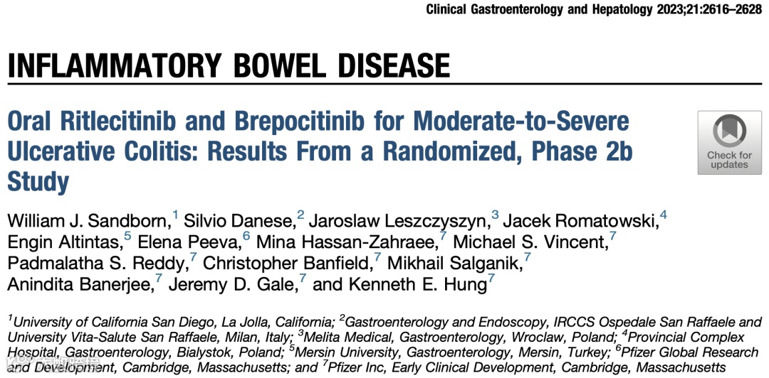 2023年《 Clinical Gastroenterology and Hepatology 》(IF=12)杂志发表一篇《 Oral Ritlecitinib and Brepocitinib for Moderate-to-Severe Ulcerative Colitis: Results From a Randomized, Phase 2b Study 》