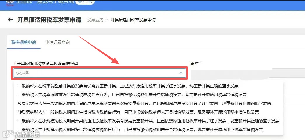 系统显示原适用税率发票权限类型选择界面,需根据实际业务勾选对应情形。