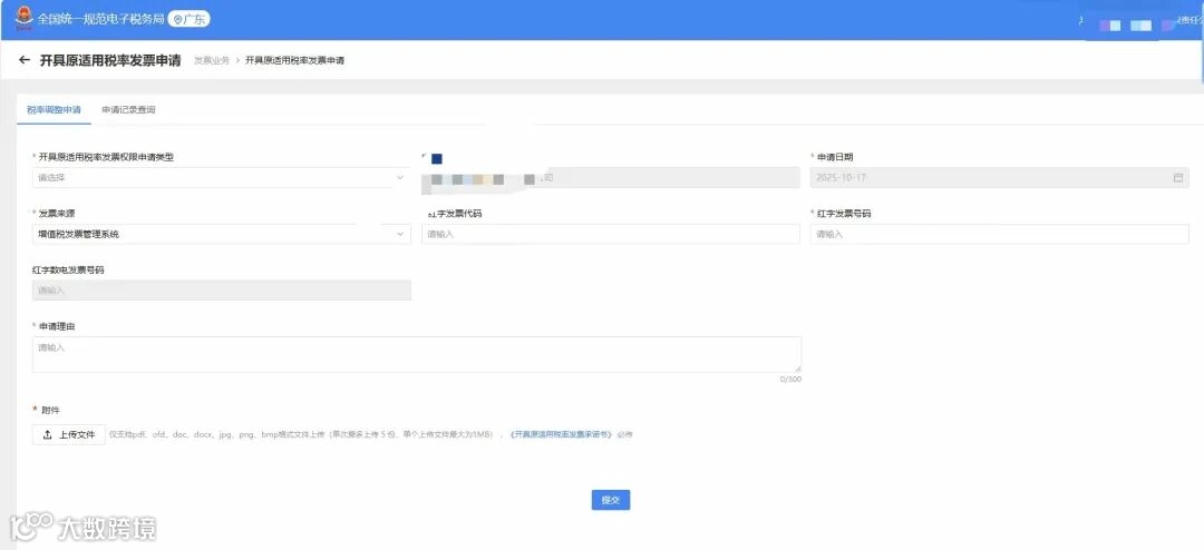 在发票业务界面中,点击【开具原适用税率发票申请】功能菜单(该功能位于"特色业务"或"跨区域业务"栏目下)。