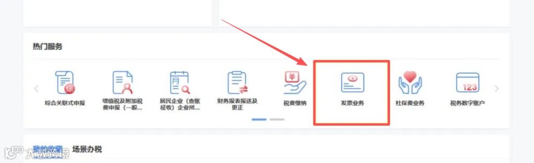 纳税人登录电子税务局后,选择【我要办税】-【发票使用】-【发票业务】入口。