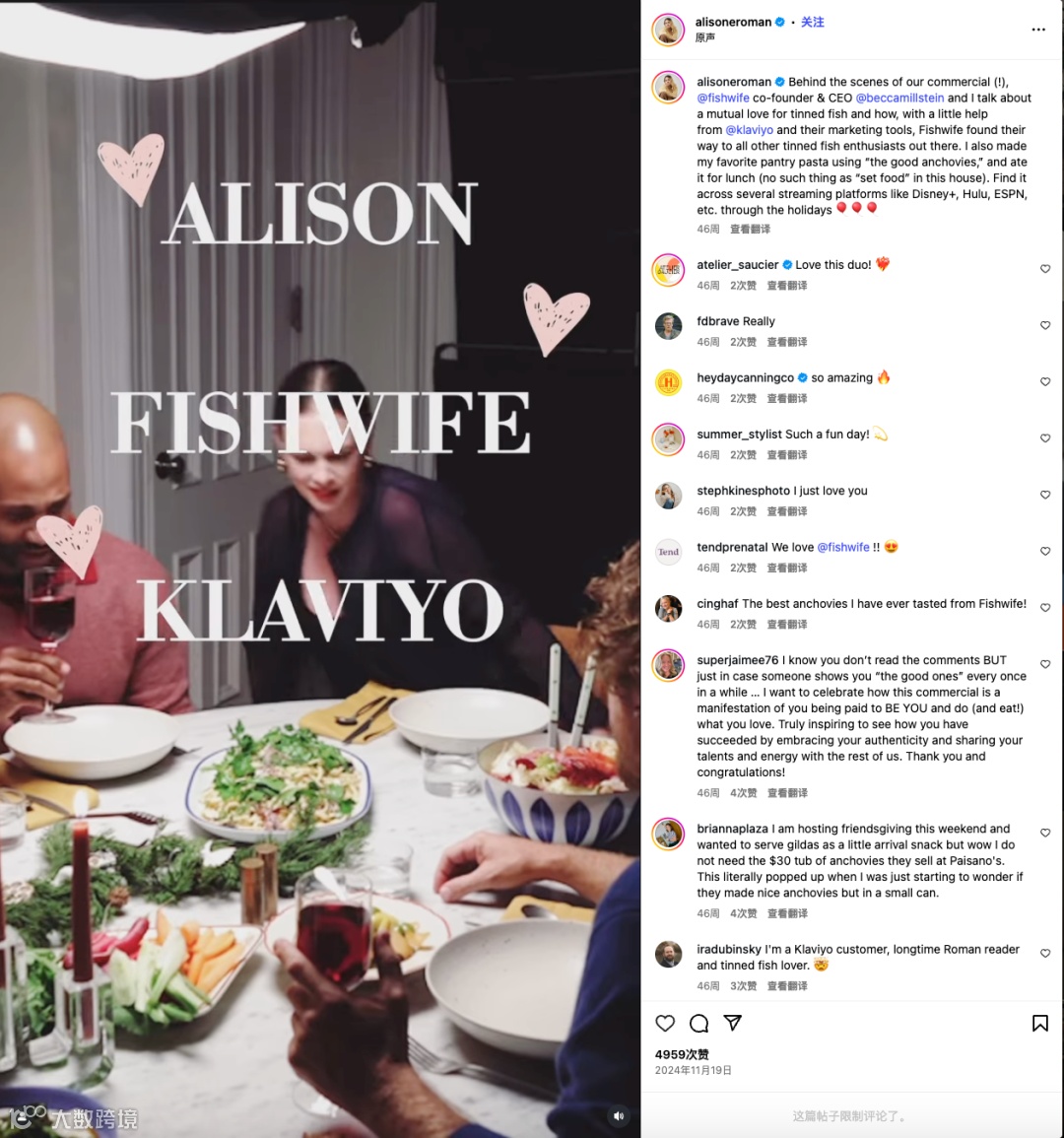 除了上述的自有内容以外,Fishwife 还深谙红人合作的叙事逻辑和商业前景。2023年,品牌与知名KOL兼厨师 Alison Roman 合作,联手推出了黑五档期活动“Make Every Moment Count”。