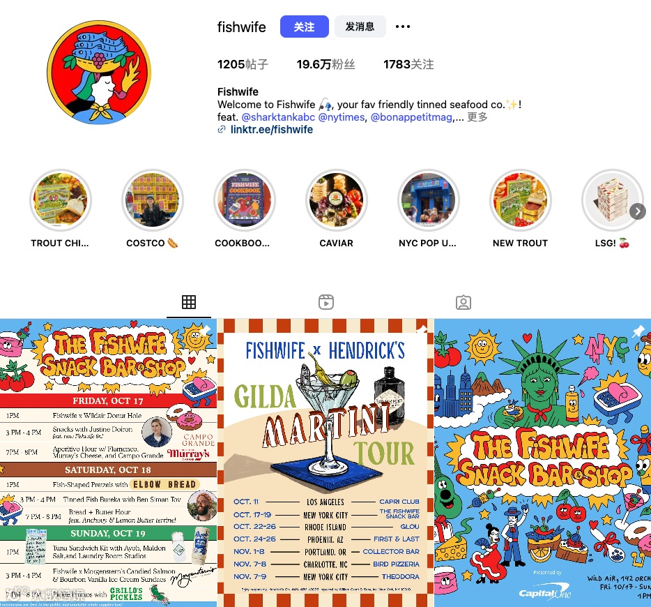 这首先体现在设计上,Fishwife的罐头以明亮的色彩、充满趣味的插画包装和独特的女性形象为视觉核心,在社交媒体和货架上极具辨识度。许多用户在晒餐照片时,不仅展示食物本身,更刻意把 Fishwife 的罐头放在画面中,作为生活态度的一部分。这种“包装即内容”的设计策略,使品牌在 Instagram 和 TikTok 上自带传播力。