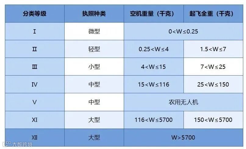 按无人机重量分为 6 类(I-V 类、XI 类),III 类(小型)及以上必须持证,具体划分如下: