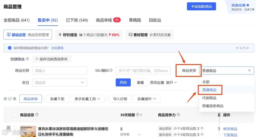 1)设置规则:代销品不支持区域限购,需由供销商设置,但代销商无法设置。(商品类型可以通过筛选条件查询)