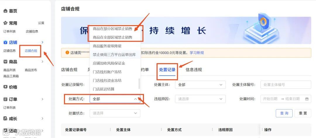 京麦店铺合规-处置记录-处置方式 |