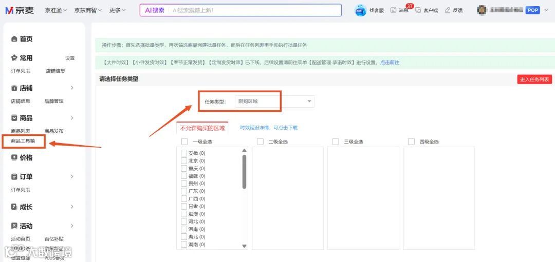 A:POP商家您有2个入口可以操作。入口1商品列表,您勾选单个商品可以查看过往被限购的地区,取消勾选、点击确认即可。如果是批量勾选多个SPU,您打开地区弹窗、不勾选任何地区,直接点击确认即可;入口2商品工具箱,您无论之前是否设置,再设置一遍不选中禁售地区,即可生效。