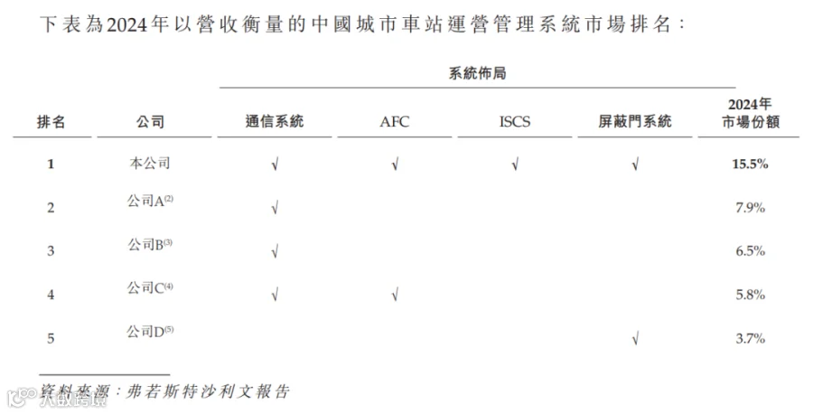 根据弗若斯特沙利文(Frost & Sullivan)报告,2024年中国城市车站运营管理系统市场规模达人民币143亿元,前五大企业的市场份额为39.4%。以2024年营收来看,公司在中国城市车站运营管理系统市场排名第一,占有15.5%的份额。