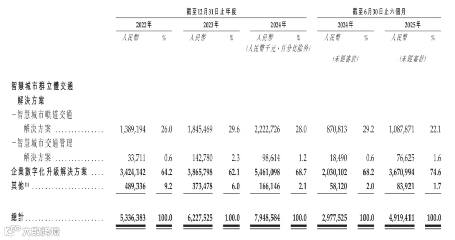 公司的产品与解决方案可分为三大类,即(i)智慧城市群立体交通解决方案,涵盖智慧城市轨道交通及智慧城市交通管理解决方案;(ii)企业数字化升级解决方案;以及(iii)其他。