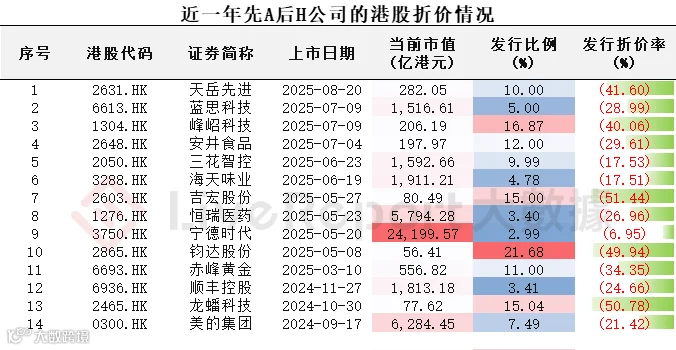 截至2025年9月26日,近一年成功赴港上市的A股公司合计14家,平均发行折价率约为31.56%。